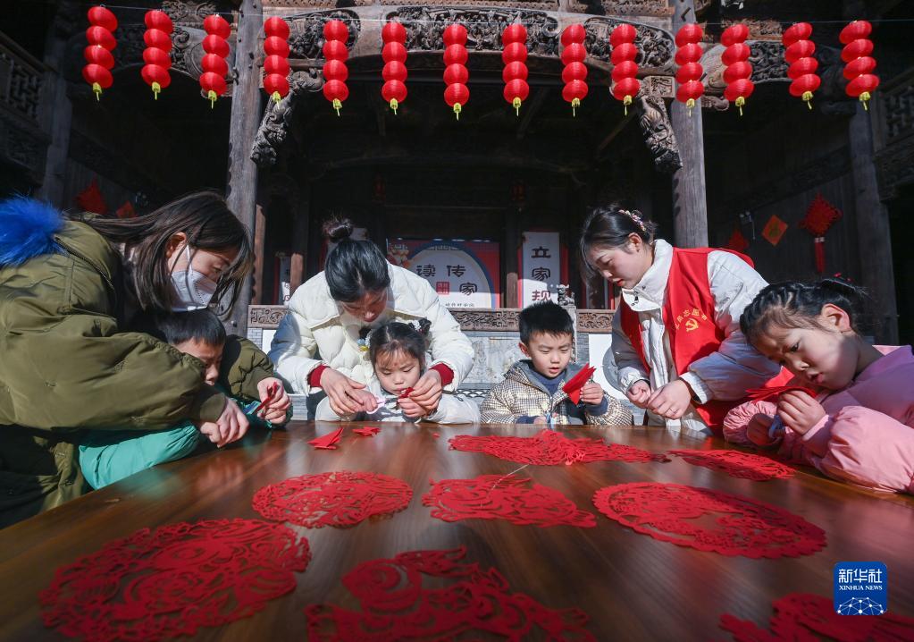 1月18日,在長興縣李家巷石泉村的古建筑“百桌廳”內,孩子們在教師志愿者的帶領下學習剪紙。