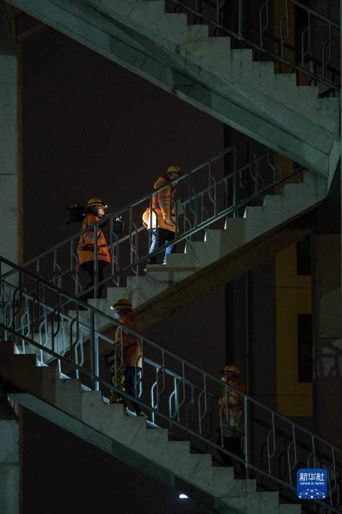 1月17日夜,鐵路工人沿著檢修通道攀登上杭臺高鐵椒江特大橋橋面。