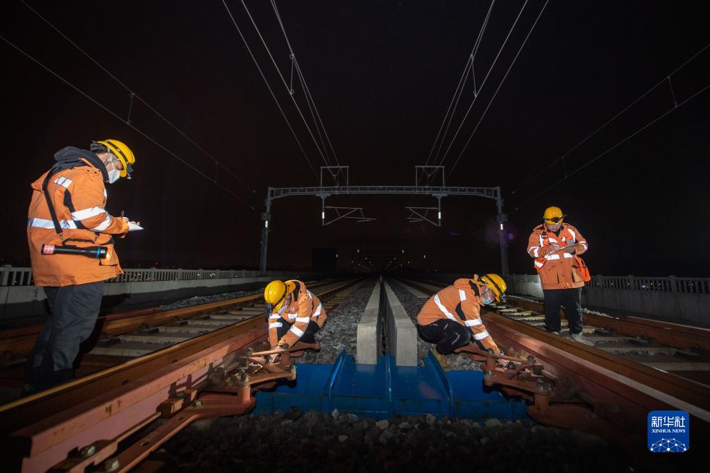 1月17日夜,鐵路工人對杭臺高鐵椒江特大橋進(jìn)行檢查作業(yè)。