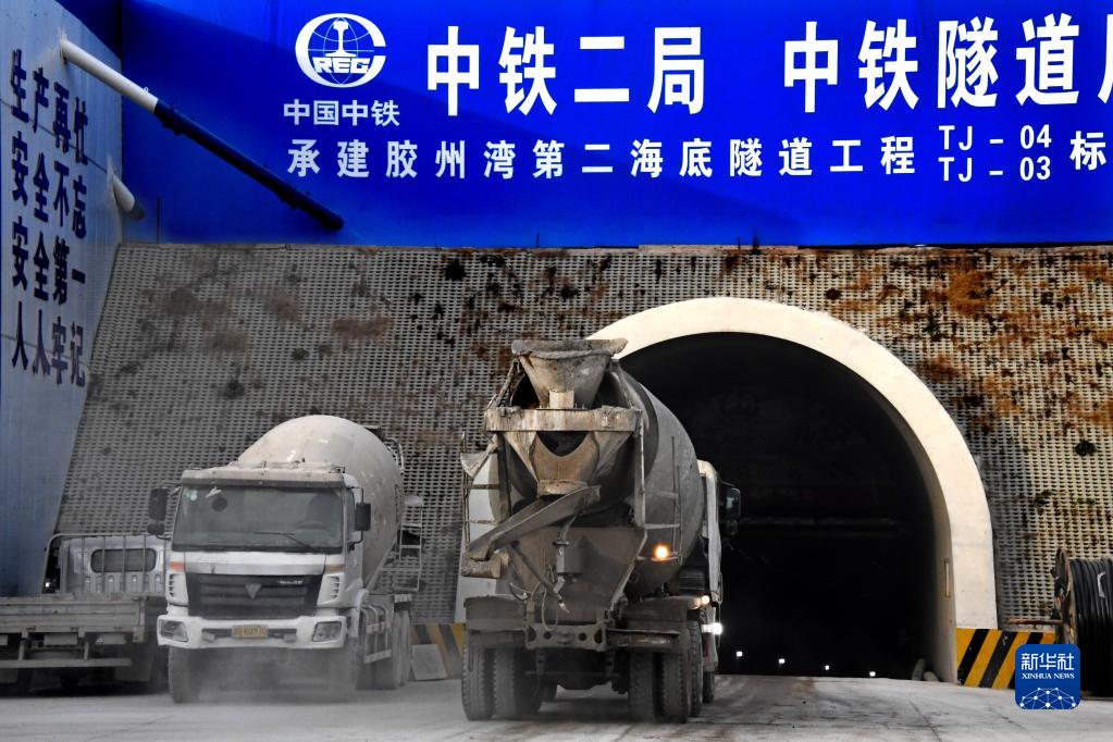 1月17日,運送水泥的工程車輛準(zhǔn)備從施工隧道進入海底。