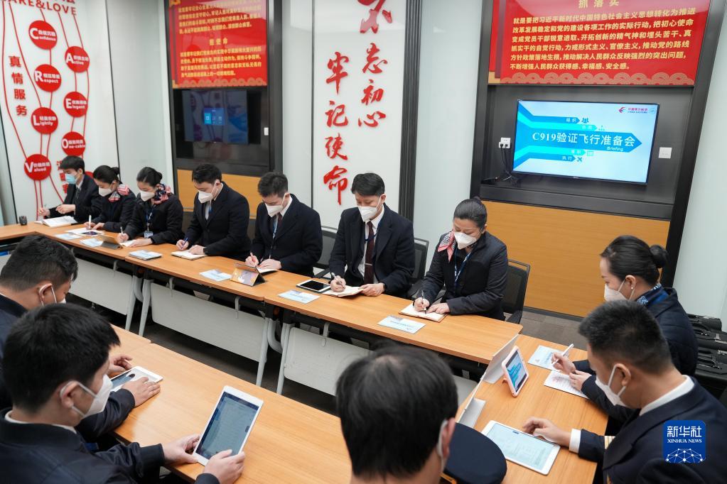 在東航的工作區(qū)內(nèi),機組人員在進行C919驗證飛行準備會(1月9日攝)。