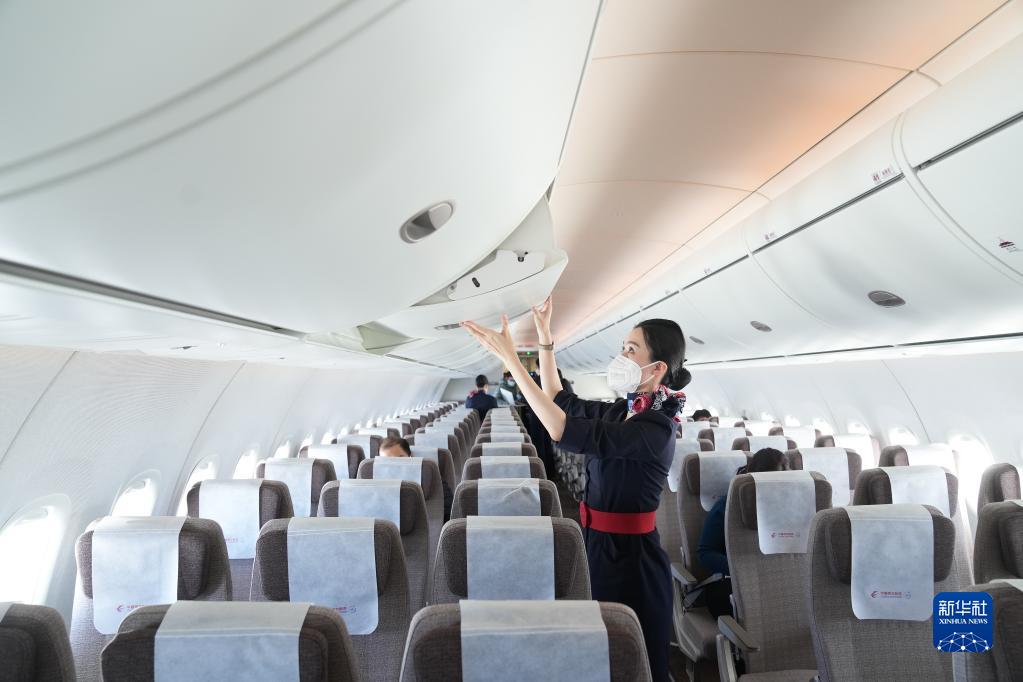 東航的C919飛機乘務員在客艙內工作(1月9日攝)。