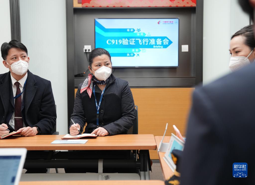 在東航工作區內,機組人員在進行C919驗證飛行準備會(1月9日攝)。