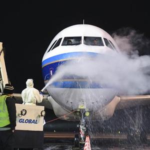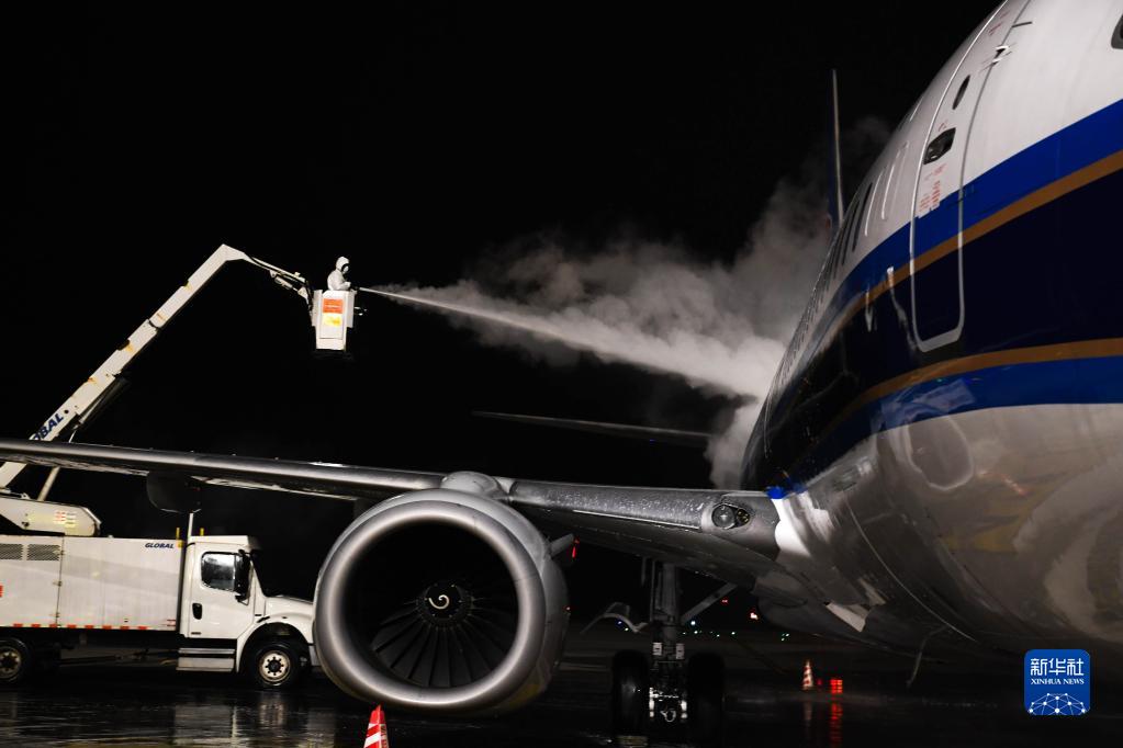 1月17日晚,在貴陽龍洞堡國際機場,南方航空的機務人員進行除防冰作業。