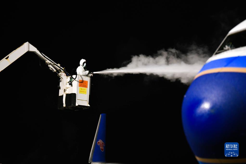 1月17日晚,在貴陽龍洞堡國際機場,南方航空的機務人員進行除防冰作業。