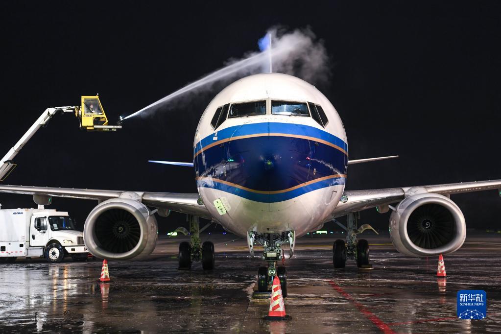 1月17日晚,在貴陽(yáng)龍洞堡國(guó)際機(jī)場(chǎng),南方航空的機(jī)務(wù)人員進(jìn)行除防冰作業(yè)。