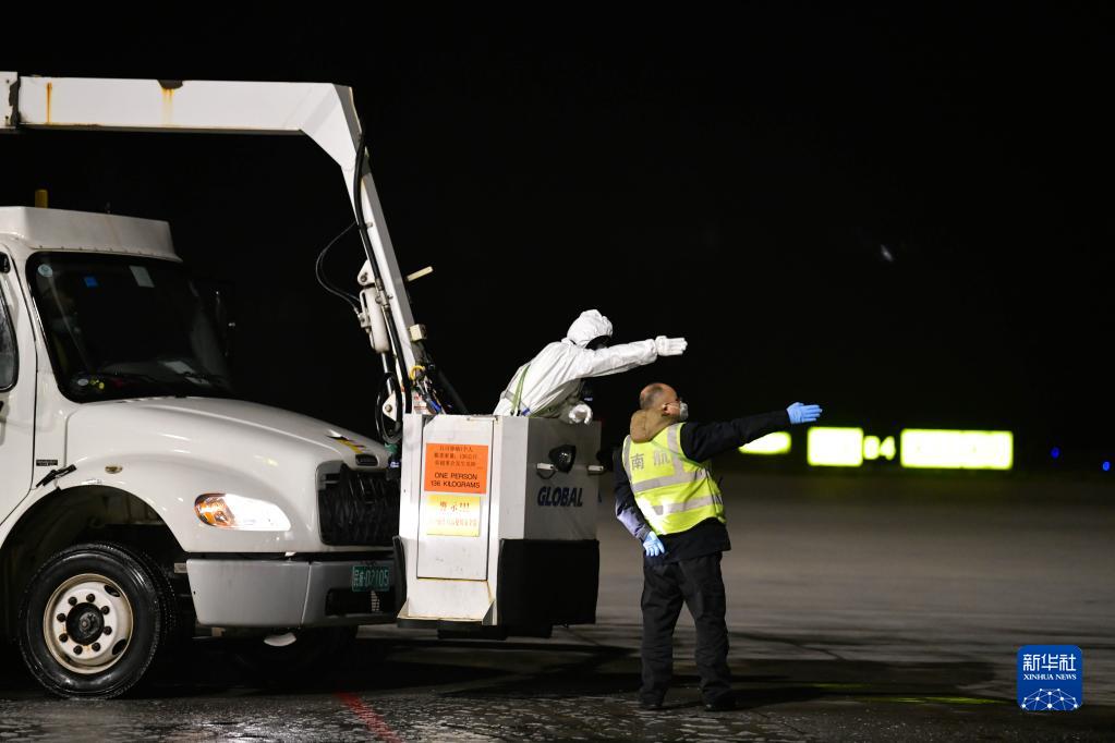 1月17日晚,在貴陽龍洞堡國際機場,南方航空的機務人員在飛機除防冰作業前進行手勢交流。