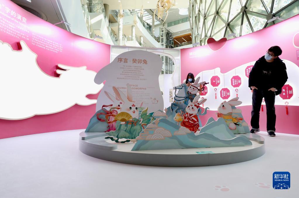 1月18日,參觀者在一組兔子主題的卡通造型裝飾旁駐足觀看。