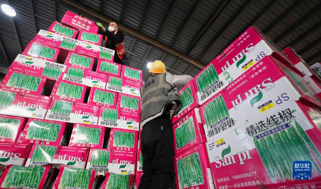 1月17日,在上海江橋蔬菜批發市場內,工人搬運來自海南的辣椒。