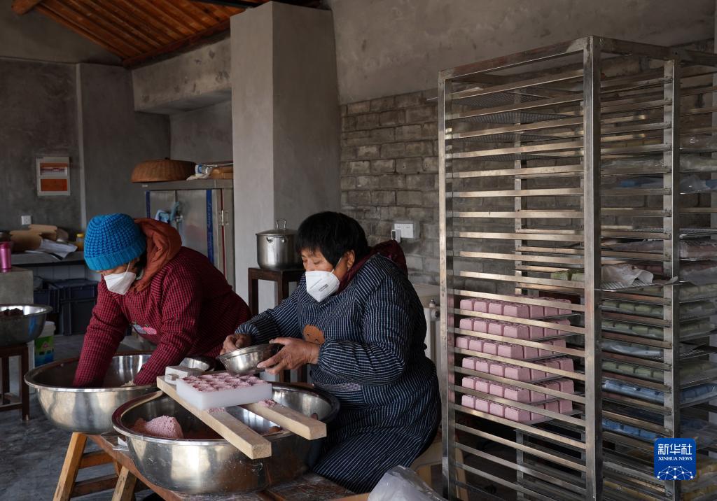 1月17日,在青浦區練塘鎮的米樂農莊,居民趕制傳統特色糕點奘糕。