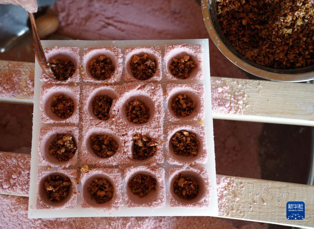 1月17日,在青浦區練塘鎮的米樂農莊,居民制作紅棗核桃餡的奘糕。