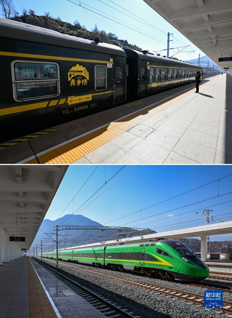 拼版照片:上圖是1月16日,攀枝花開往普雄的5634次“慢火車”駛過冕寧站;下圖是1月16日,一列“復興號”動車組駛過冕寧站。