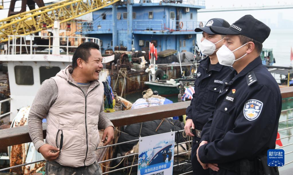 1月18日,在??谛赂鄞a頭,海南省公安廳海岸警察總隊第一支隊民警叮囑漁民安全注意事項。