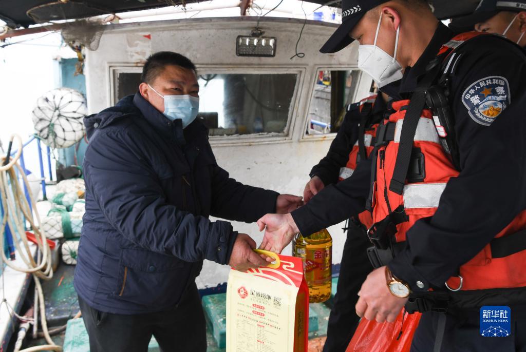 1月18日,在??谛赂鄞a頭,海南省公安廳海岸警察總隊第一支隊民警將慰問品帶給仍留守在船上的漁民。