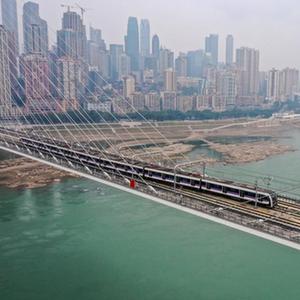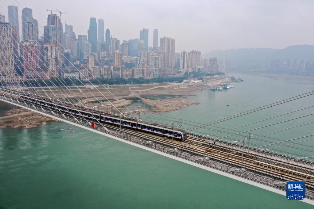 1月18日,重慶軌道交通10號線列車通過南紀(jì)門軌道大橋(無人機(jī)照片)。