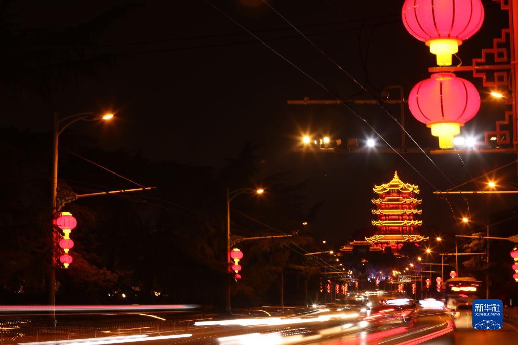 湖北省武漢市黃鶴樓附近路段夜景(1月17日攝,無人機照片)。
