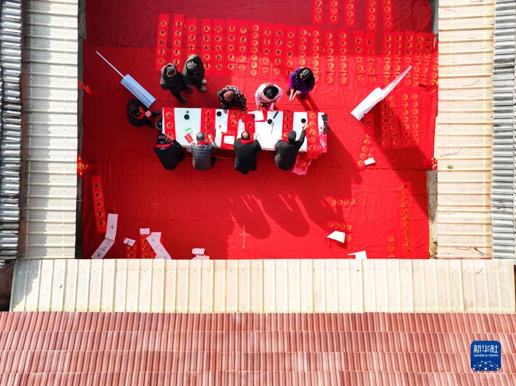 1月18日,在江蘇省泗洪縣界集鎮武崗村,書法志愿者為村民寫春聯(無人機照片)。