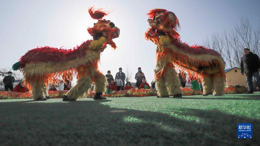 1月18日,遵化市建明鎮(zhèn)穆家莊村的民間藝人在表演舞獅。