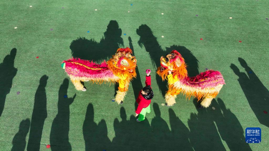 1月18日,遵化市建明鎮穆家莊村的民間藝人在表演舞獅(無人機照片)。