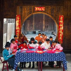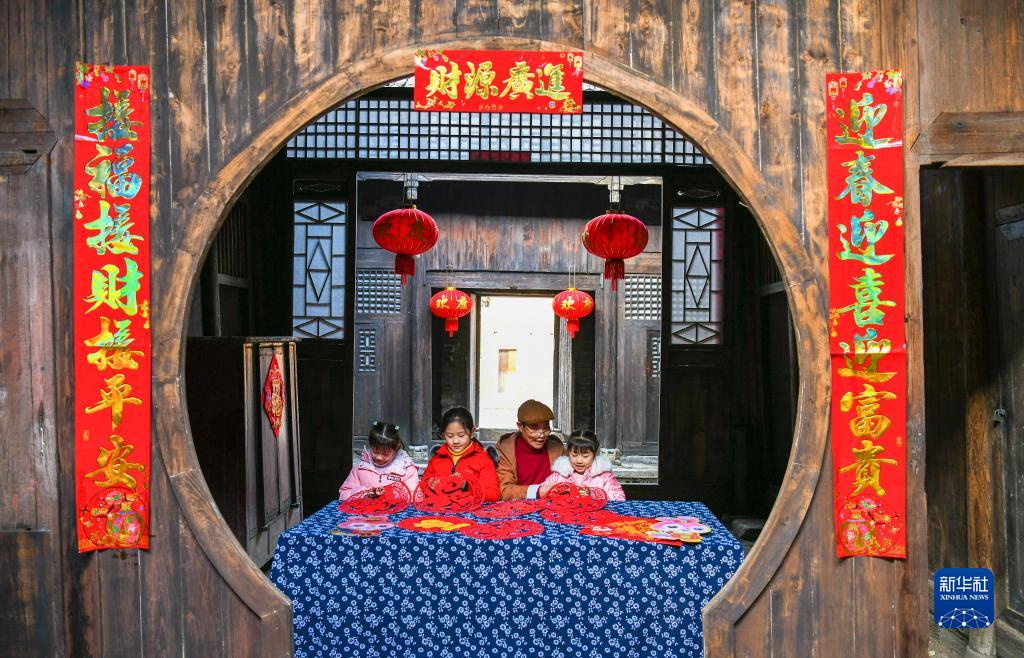 1月18日,在常寧市廟前鎮中田古村,常寧市剪紙非遺傳承人指導小朋友們練剪“廉”字、“福”字。