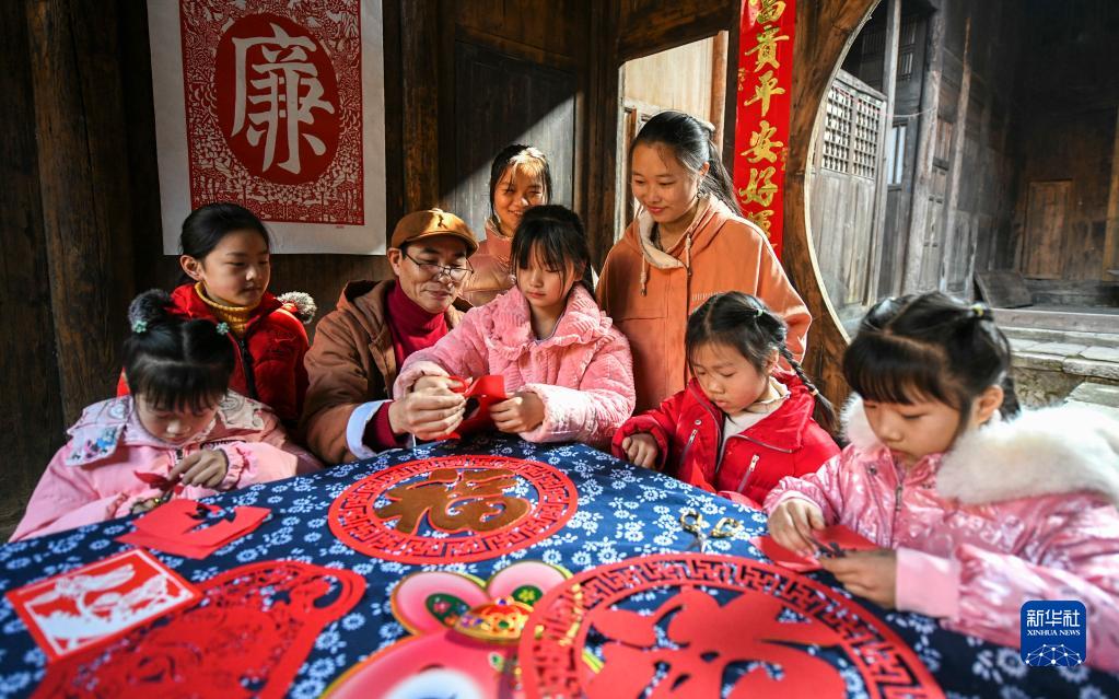1月18日,在常寧市廟前鎮(zhèn)中田古村,常寧市剪紙非遺傳承人指導(dǎo)小朋友們練習(xí)“廉”字、“?!弊?。