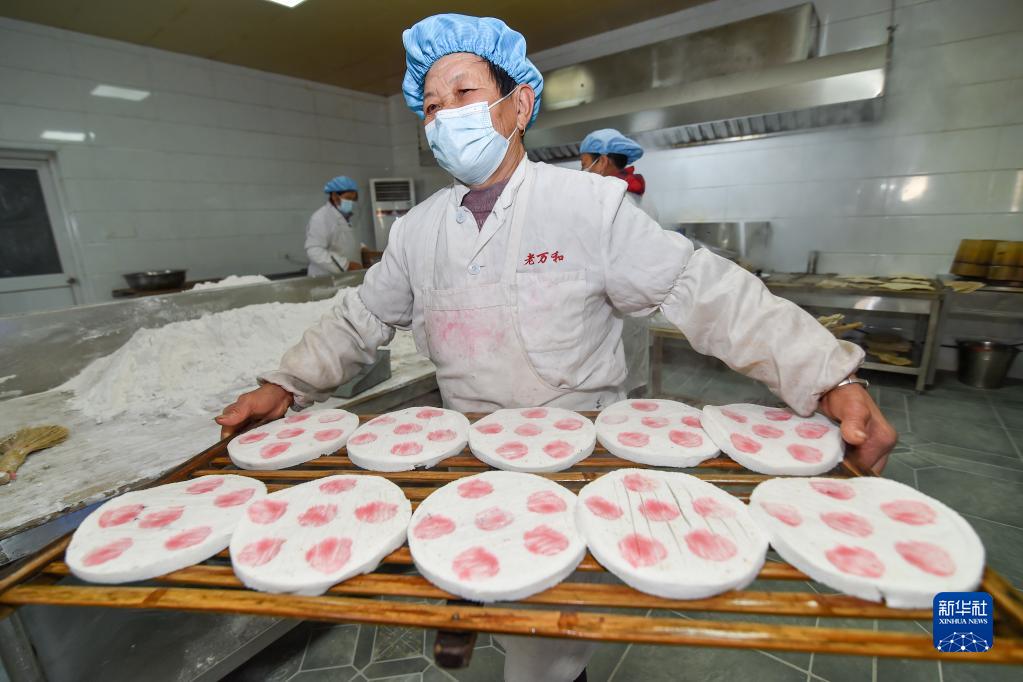 1月17日,在江蘇省南通市如皋市老萬和潮糕店,工作人員在運送林梓潮糕。林梓潮糕是當地傳統點心,由糯米、粳米加工成米粉,拌上白糖、桂花等制成糕坯,再經多道工序蒸制而成。