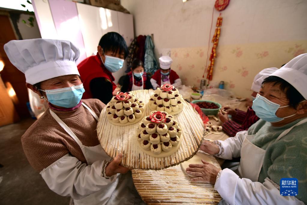 1月19日,山東省聊城市茌平區賈寨鎮的村民在展示制作好的花糕。