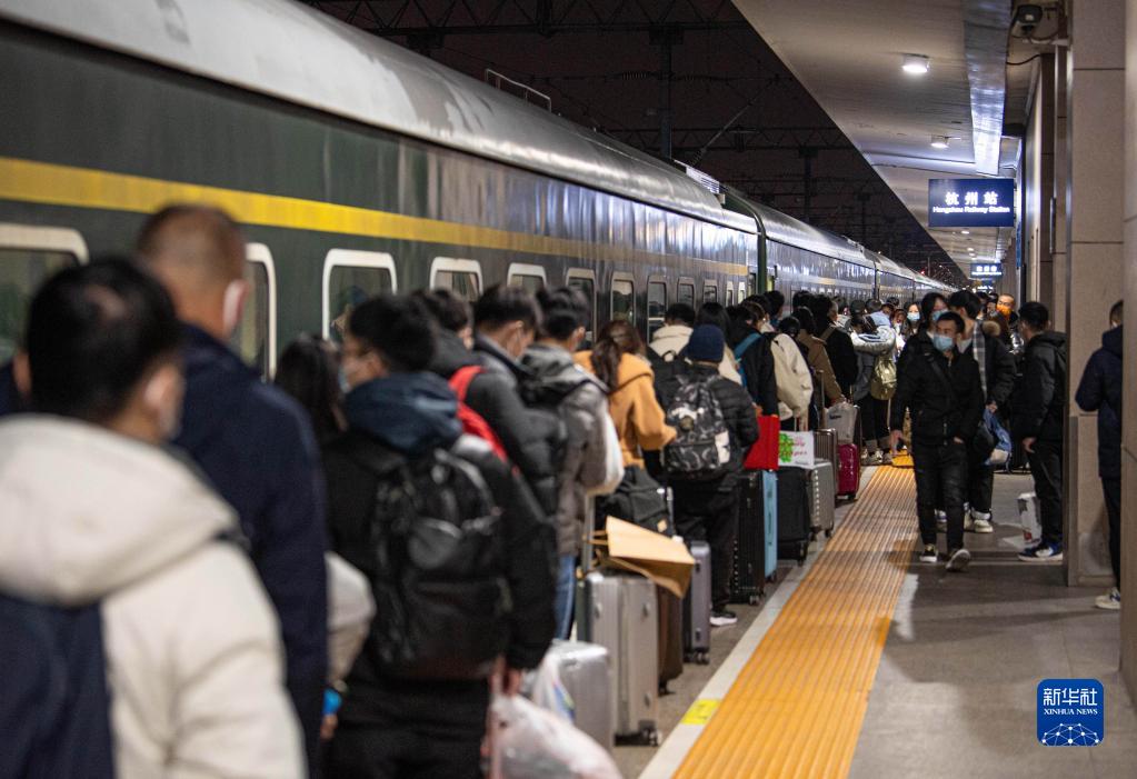 1月18日傍晚,等待登上K209次列車的旅客在杭州站站臺上排起長隊。
