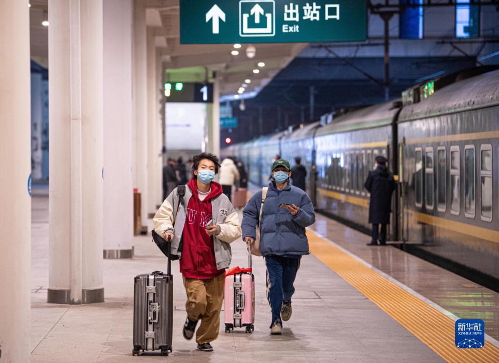 1月18日,準備乘坐K209次列車的旅客在金華站站臺上奔跑。