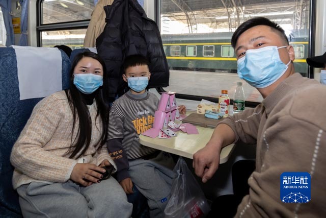 1月18日,在1462次列車上,沈連杰(右)一家三口在回家的路上玩紙牌。時(shí)隔3年,沈連杰一家三口返回安徽蚌埠老家過(guò)春節(jié)。