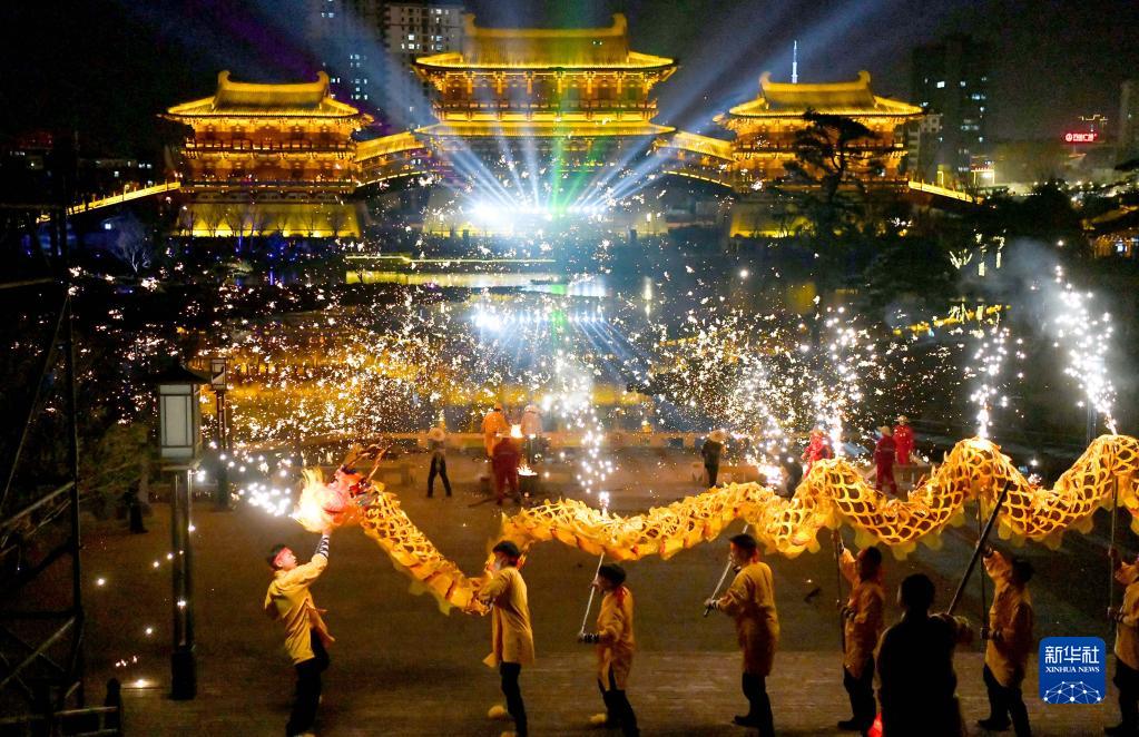 1月18日,游客在河南省洛陽市隋唐洛陽城九洲池景區觀看打鐵花和舞龍表演。