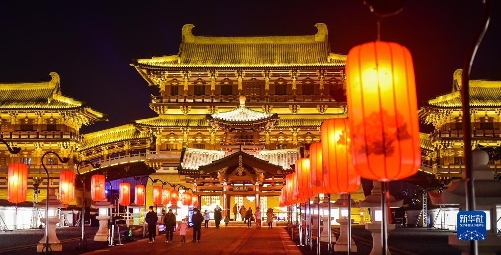 1月18日,游客在河南省洛陽市隋唐洛陽城九洲池遺址公園游玩賞燈。