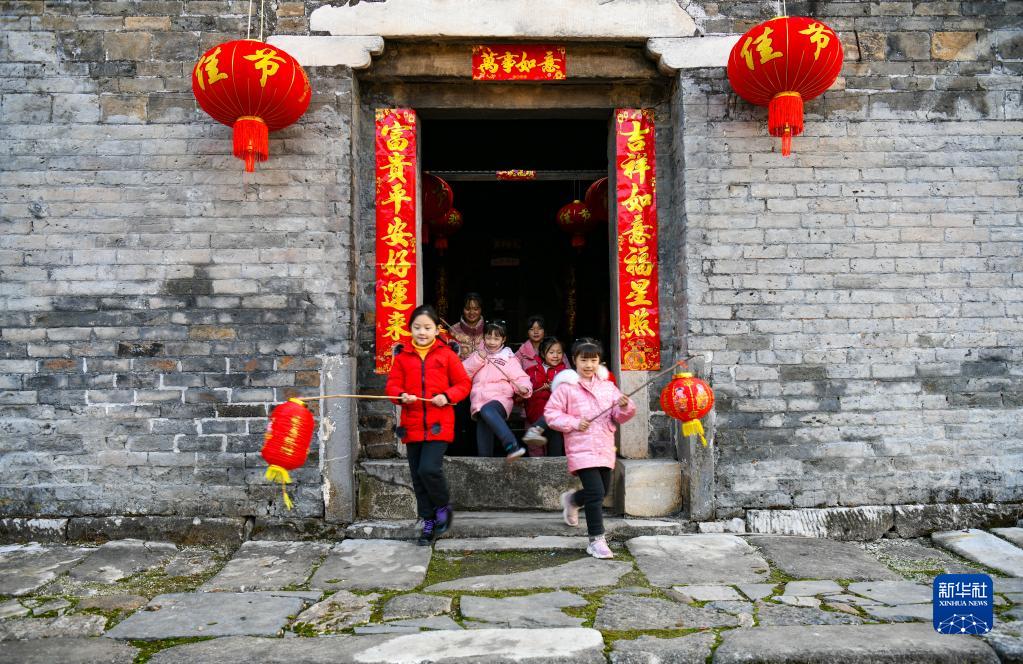 1月18日,在湖南省常寧市廟前鎮中田古村,小朋友手提燈籠。