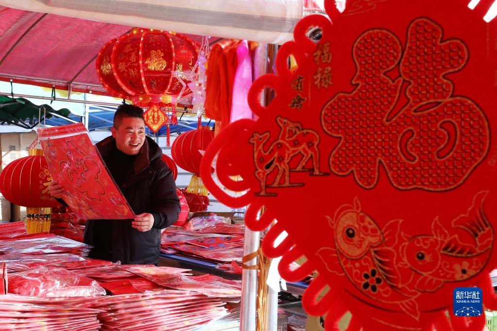 1月19日,村民在河南省焦作市溫縣溫泉街道東南王村年集上選購春節飾品。
