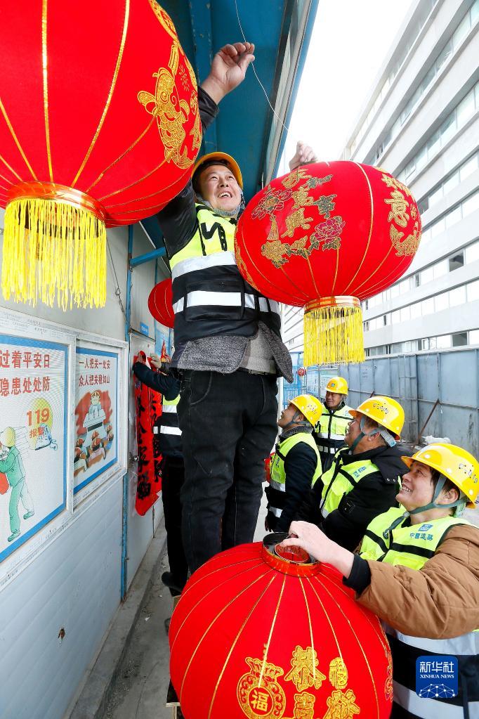 1月19日,在山東省青島市即墨區(qū)陸港臨空云創(chuàng)中心項目工地,中建八局四公司務(wù)工人員在生活區(qū)掛燈籠。