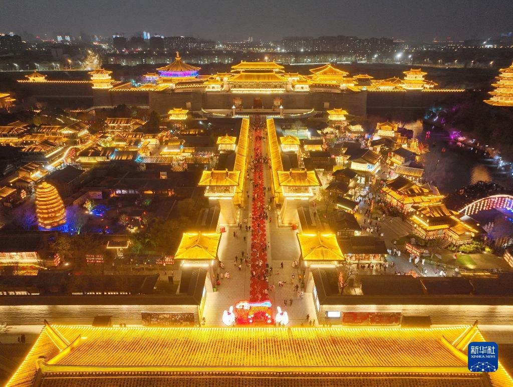 1月18日,游客在湖北省襄陽市唐城景區游覽(無人機照片)。