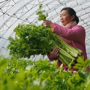 1月19日,唐山市豐潤區任各莊鎮的農民在大棚內采收芹菜。