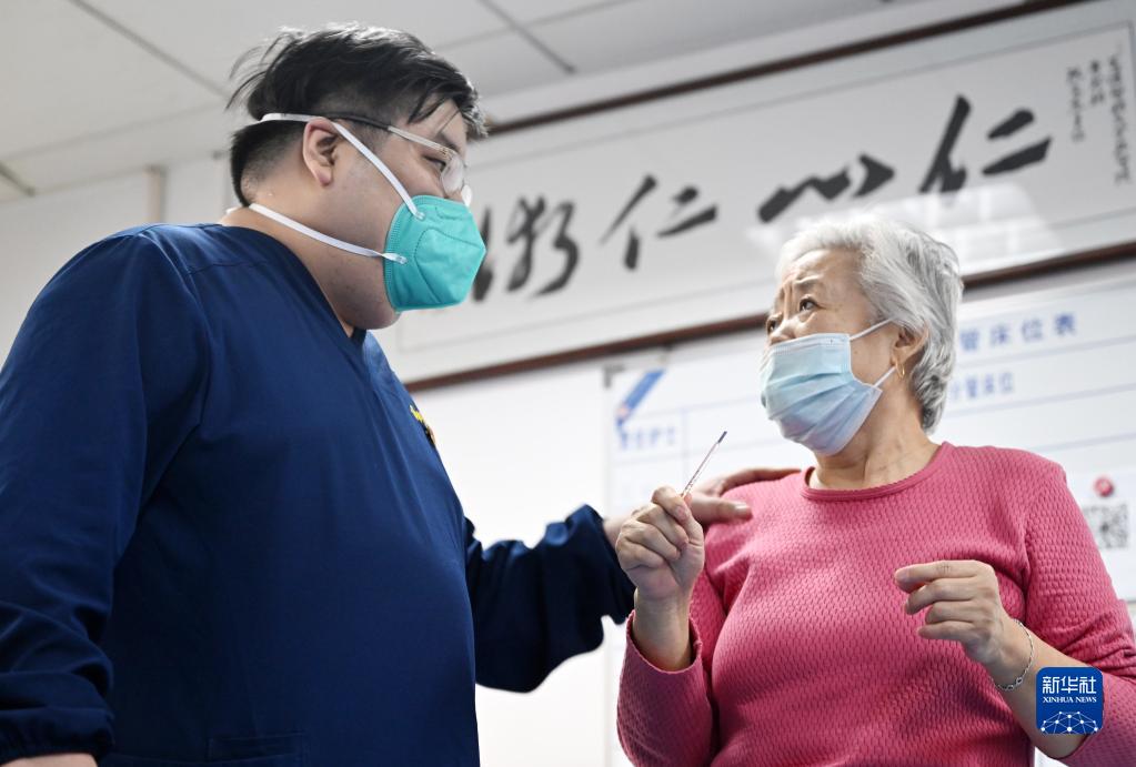 在天津醫(yī)科大學(xué)總醫(yī)院,劉洋(左)和一位老人交流(1月18日攝)。