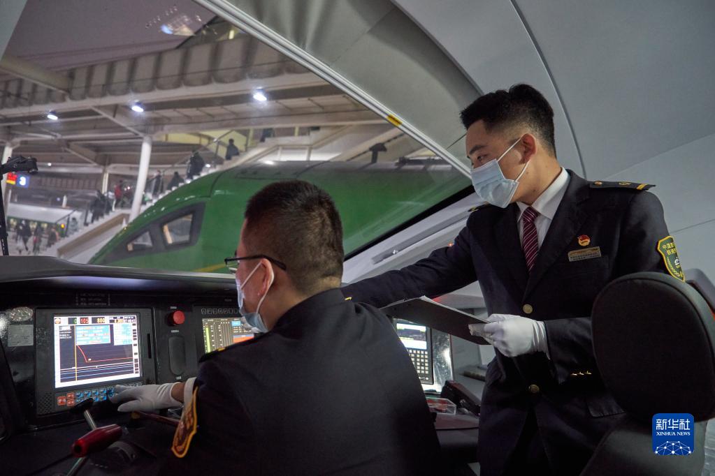 1月17日,在成都南站,擔任副司機的沙馬伍且(右)在D871次復興號機車駕駛室輔助司機進行開車前各項準備。