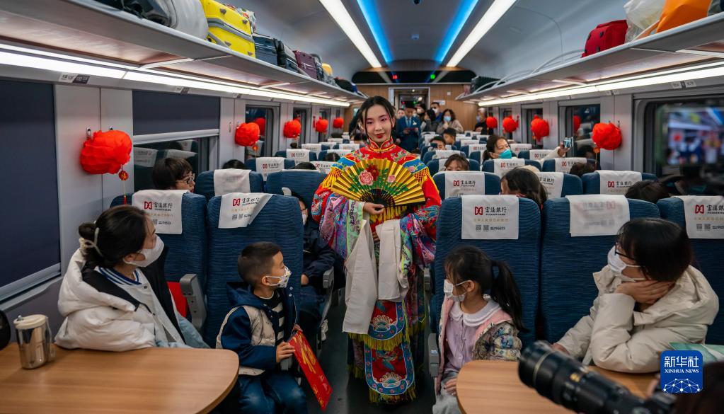1月19日,京劇演員在車廂內(nèi)表演《貴妃醉酒》選段。