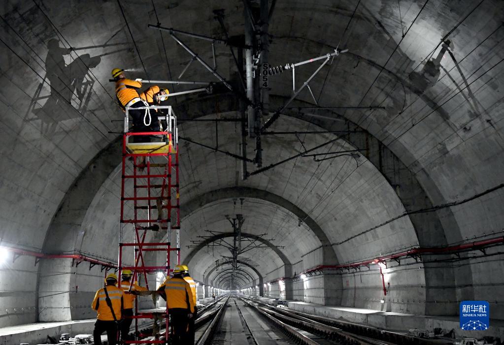 1月19日凌晨,鄭州高鐵基礎設施段作業(yè)人員在新鄭機場站北岔區(qū)檢查接觸網(wǎng)定位裝置狀態(tài)。