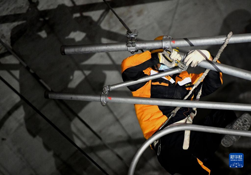 1月19日凌晨,鄭州高鐵基礎(chǔ)設(shè)施段作業(yè)人員對新鄭機場站北岔區(qū)接觸網(wǎng)支撐裝置進(jìn)行檢修。