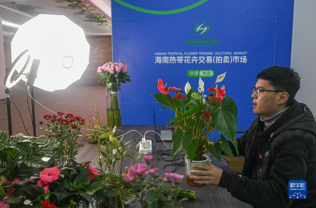 1月18日,在海南熱帶花卉交易(拍賣)市場,該市場抖音電商運營團隊的主播在直播介紹熱帶花卉。