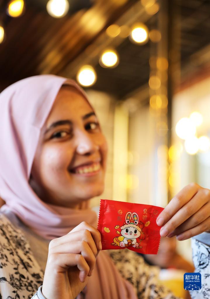 1月18日,一位顧客在位于埃及首都開羅的一家烘焙坊內感受中國春節(jié)氛圍。臨近中國農(nóng)歷春節(jié),這家烘焙坊推出兔年春節(jié)主題裝飾與商品,增添節(jié)日氣氛、吸引消費者。