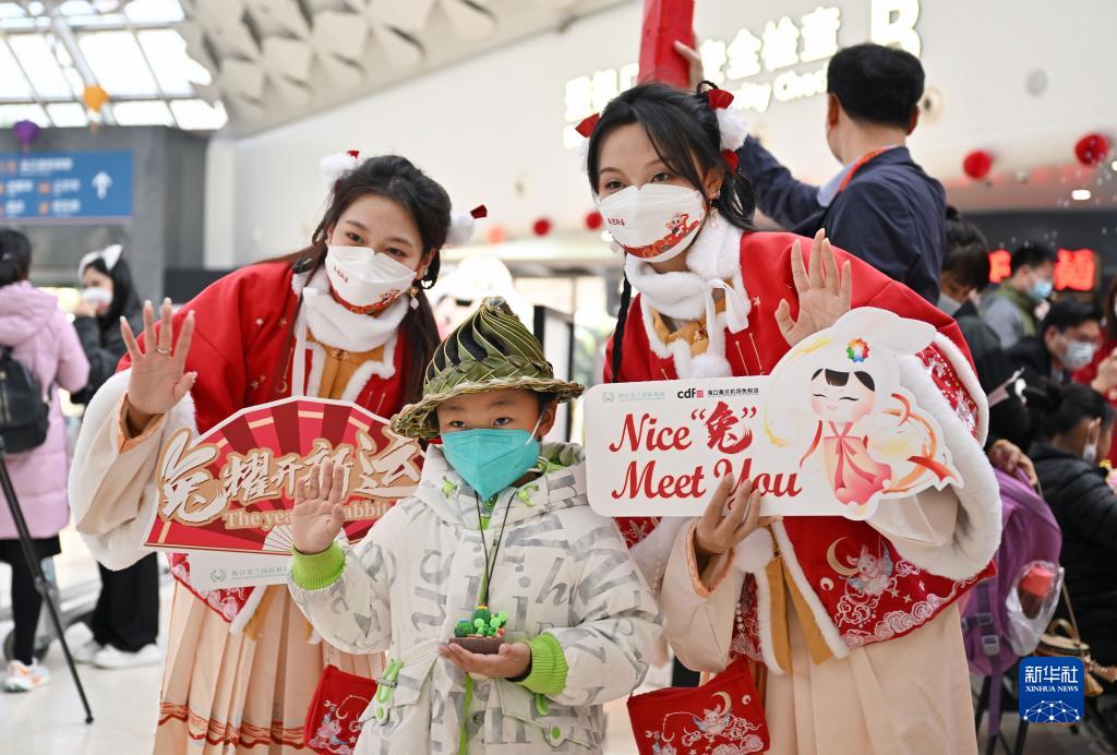 1月19日,在海口美蘭國際機場出發大廳,小朋友和工作人員合影留念。