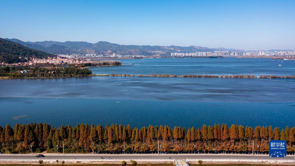 云南省昆明滇池一景(2023年1月12日攝,無(wú)人機(jī)照片)。