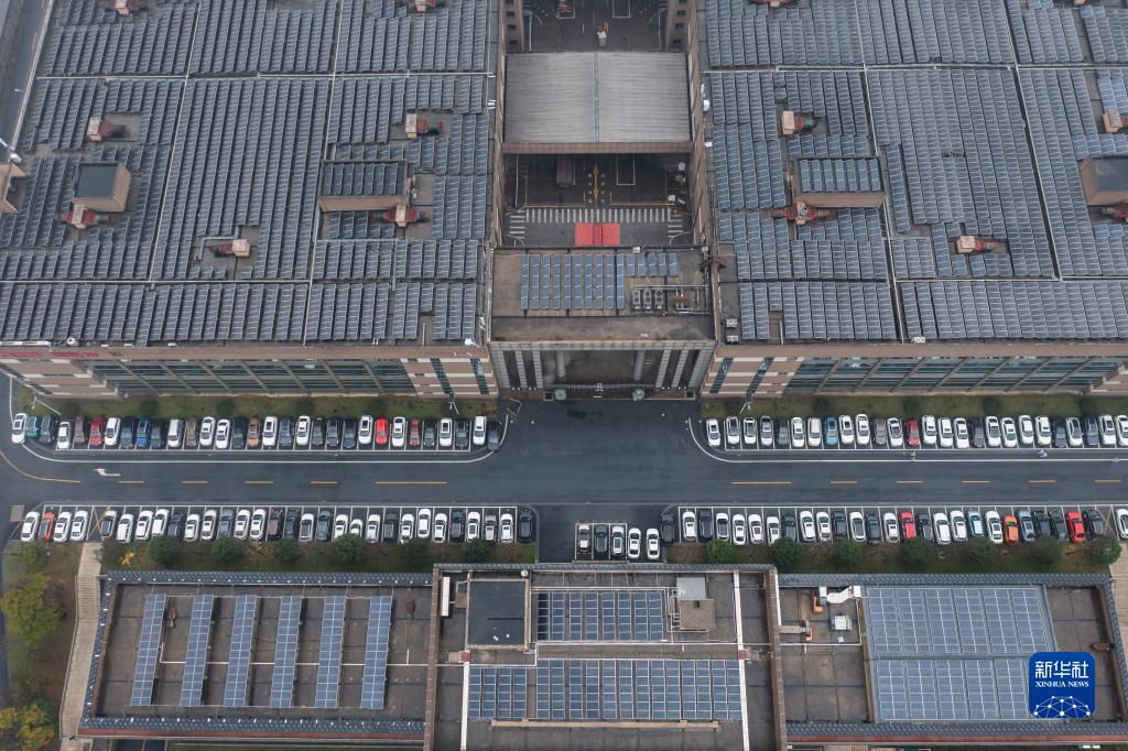 這是浙江省杭州市臨安區金馬工業園區內的一家“無廢工廠”,屋頂上安裝了光伏發電設備(2022年12月9日攝,無人機照片)。