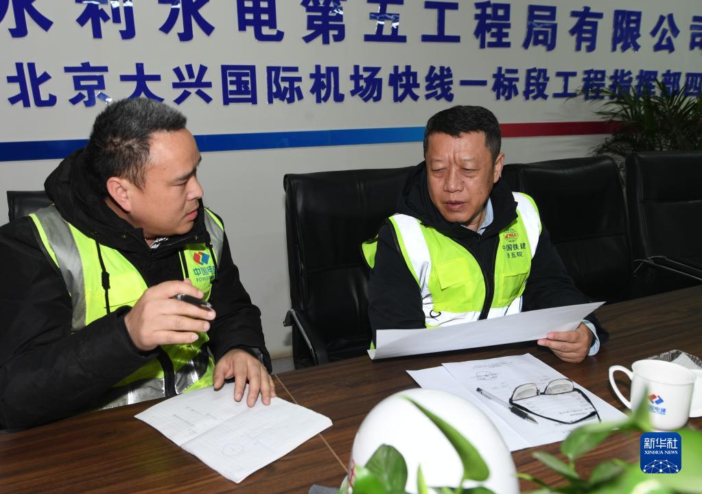 梅東冬(右)在雄安新區至北京大興國際機場快線(R1線)一標段項目部工作(1月18日攝)。