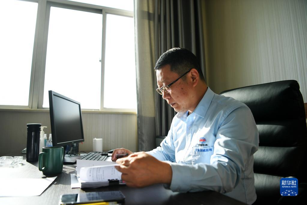 梅東冬在雄安新區至北京大興國際機場快線(R1線)一標段項目部辦公室工作(1月18日攝)。