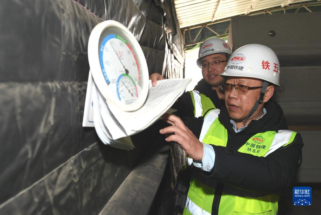 梅東冬(前)在雄安新區至北京大興國際機場快線(R1線)一標段項目工地巡查(1月18日攝)。
